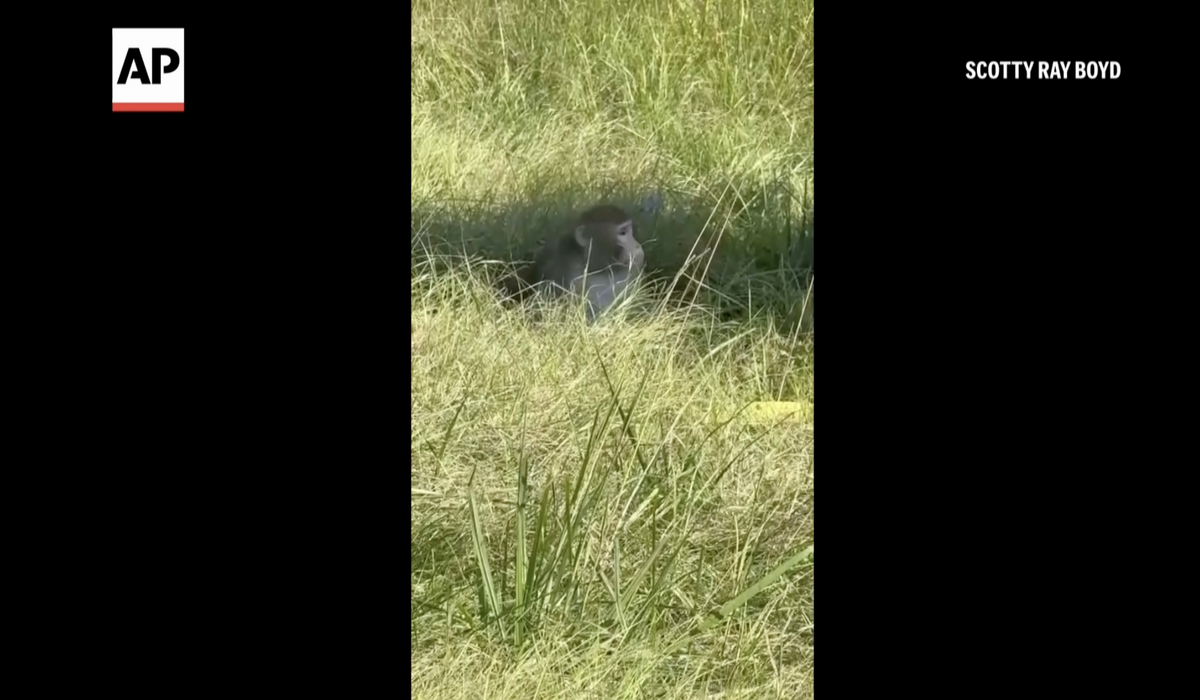 Video shows monkeys crawling through tall grass on the side of Interstate 59 just north of Heidelberg, Mississippi, with wooden crates labeled “live animals” crumpled and strewn about.